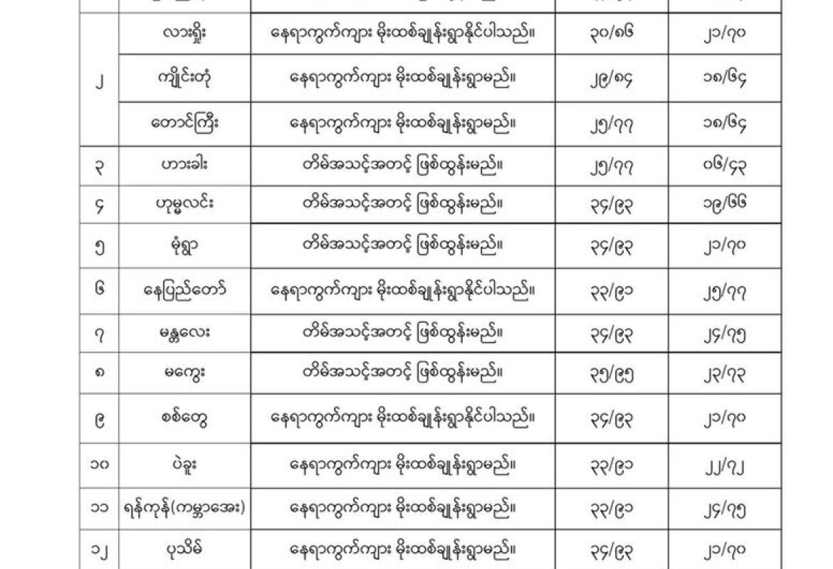 ယနေ့ညနေအထိခန့်မှန်းချက်မှာ ရန်ကုန်တိုင်းဒေသကြီးနှင့် တနင်္သာရီတိုင်းဒေသကြီးတို့တွင် နေရာစိပ်စိပ် မိုးထစ်ချုန်းရွာနိုင်