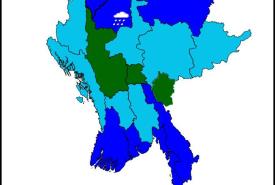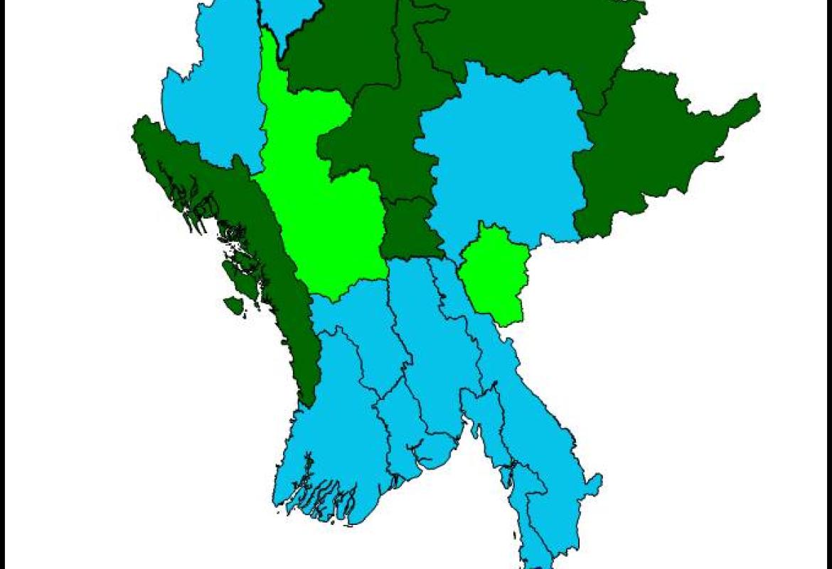 မန္တလေးတိုင်းဒေသကြီး၊ ပဲခူးတိုင်းဒေသကြီး၊ ချင်းပြည်နယ်၊ ရခိုင်ပြည်နယ်နှင့် ရှမ်းပြည်နယ်(တောင်ပိုင်းနှင့် အရှေ့ပိုင်း)တို့တွင် နေရာစိပ်စိပ်နှင့် စစ်ကိုင်းတိုင်းဒေသကြီးနှင့် ကချင်ပြည်နယ်တို့တွင် နေရာကွက်၍ မိုးကြီးနိုင်