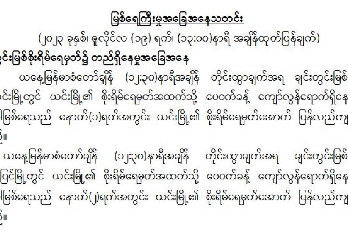မိုးလေဝသနှင့်ဇလဗေဒညွန်ကြားမှုဦးစီးဌာနမှ (၁၉.၇.၂၀၂၃) ရက်နေ့တွင် မြစ်ရေကြီးမှုအခြေအနေသတင်း