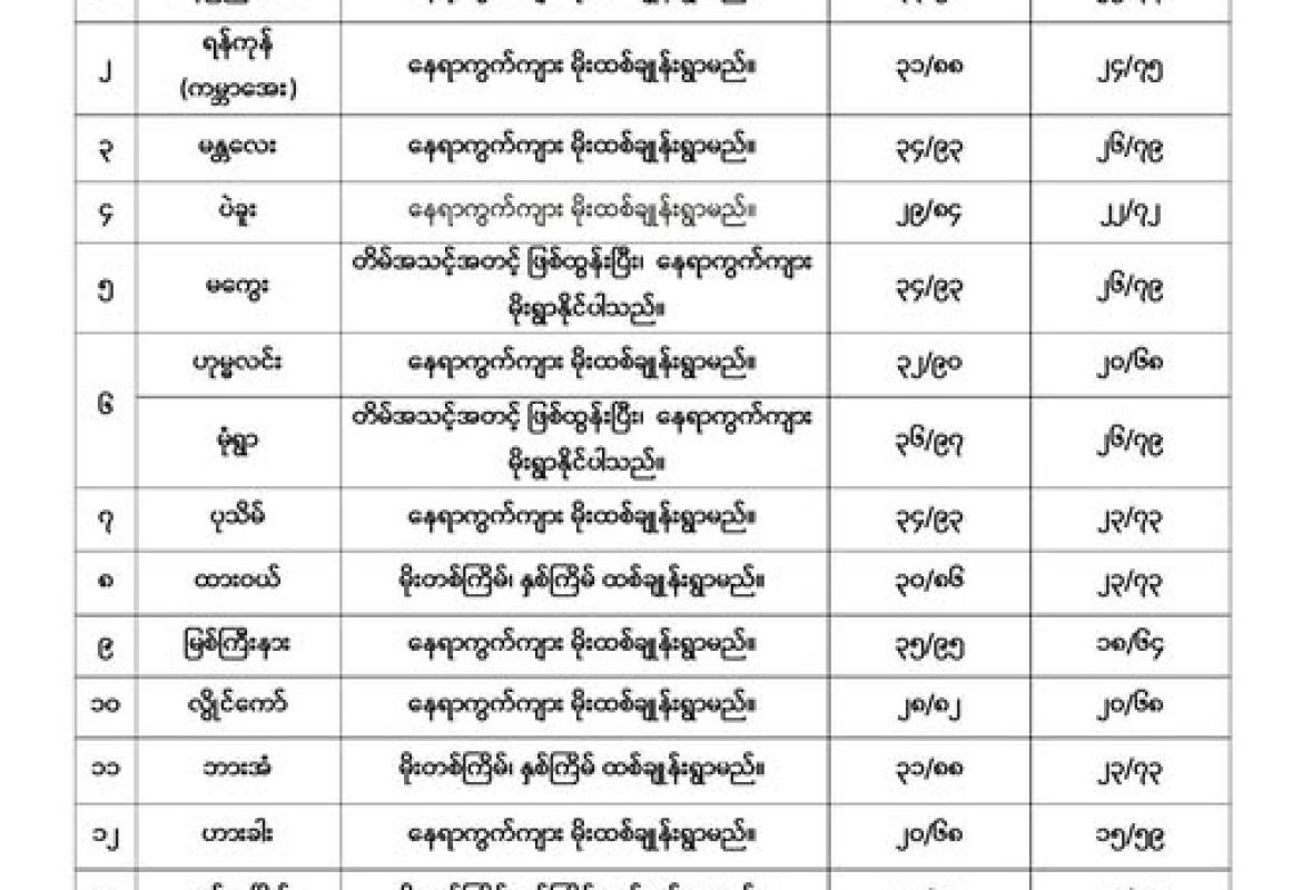 နေပြည်တော်၊ မကွေးတိုင်းဒေသကြီး၊ စစ်ကိုင်းတိုင်းဒေသကြီးနှင့် ကချင်ပြည်နယ်တို့တွင် နေရာစိပ်စိပ် မိုးထစ်ချုန်းရွာမည်