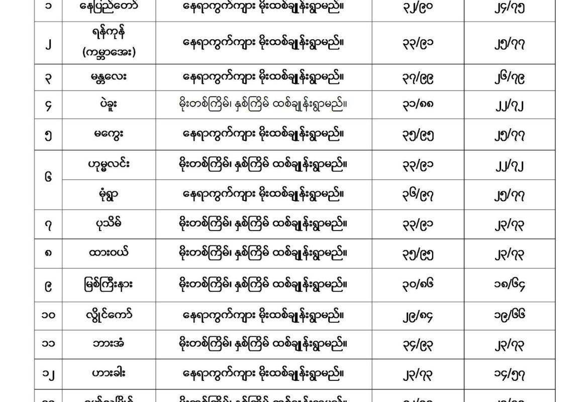စစ်ကိုင်းတိုင်းဒေသကြီးအထက်ပိုင်း၊ တနင်္သာရီတိုင်းဒေသကြီး၊ ကချင်ပြည်နယ်၊ ကရင်ပြည်နယ်၊ မွန်ပြည်နယ်နှင့် ရှမ်းပြည်နယ်တို့တွင် မိုးပိုလာနိုင်