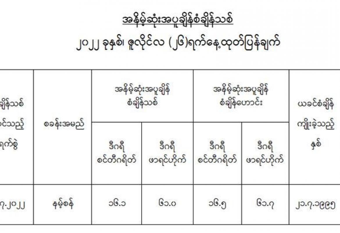 မနက်ဖြန်နံနက်အထိခန့်မှန်းချက်မှာ နေပြည်တော်၊ မကွေးတိုင်းဒေသကြီး၊ ရှမ်းပြည်နယ်(အရှေ့ပိုင်း)နှင့် ကယားပြည်နယ်တို့တွင် နေရာကွက်ကျား၊ စစ်ကိုင်းတိုင်းဒေသကြီးအောက်ပိုင်း၊ မန္တလေးတိုင်းဒေသကြီး၊ ပဲခူးတိုင်းဒေသကြီး၊ ရန်ကုန်တိုင်းဒေသကြီး၊ ဧရာဝတီတိုင်းဒေသကြီး၊ ရှမ်းပြည်နယ်(မြောက်ပိုင်းနှင့် တောင်ပိုင်း)၊ ရခိုင်ပြည်နယ်နှင့် ကရင်ပြည်နယ်တို့တွင် နေရာကျဲကျဲ၊ တနင်္သာရီတိုင်းဒေသကြီးနှင့် မွန်ပြည်နယ်တို့တွင် နေရာစိပ်စိပ်နှင့် ကျန်တိုင်းဒေသကြီးနှင့် ပြည်နယ်တို့တွင် နေရာအနှံ့အပြား မိုးထစ်ချုန်းရွာမည်။ ရွာရန်ရာနှုန်းပြည့် ဖြစ်ပါသည်။