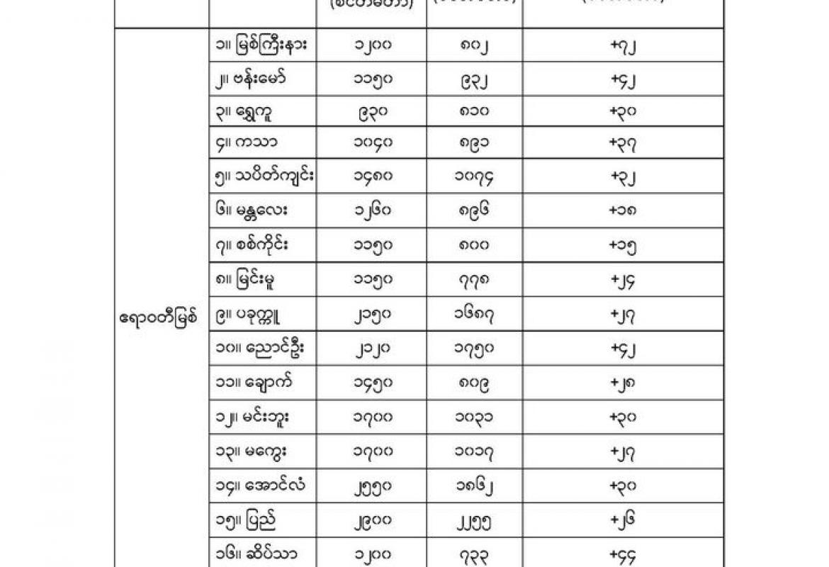 ယနေ့ညနေအထိခန့်မှန်းချက်မှာ တနင်္သာရီတိုင်းဒေသကြီးနှင့် ကရင်ပြည်နယ်တို့တွင် နေရာကျဲကျဲ၊ နေပြည်တော်၊ စစ်ကိုင်းတိုင်းဒေသကြီးအောက်ပိုင်း၊ မန္တလေးတိုင်းဒေသကြီး၊ မကွေးတိုင်းဒေသကြီး၊ ပဲခူးတိုင်းဒေသကြီး၊ ဧရာဝတီတိုင်းဒေသကြီး၊ ရခိုင်ပြည်နယ်၊ ကယားပြည်နယ်နှင့် မွန်ပြည်နယ်တို့တွင် နေရာစိပ်စိပ်နှင့် ကျန်တိုင်းဒေသကြီးနှင့် ပြည်နယ်တို့တွင် နေရာအနှံ့အပြားမိုးထစ်ချုန်းရွာပြီး စစ်ကိုင်းတိုင်းဒေသကြီး၊ မန္တလေးတိုင်းဒေသကြီး၊ ကချင်ပြည်နယ်နှင့် ရခိုင်ပြည်နယ်တို့တွင် နေရာကွက်၍ မိုးကြီးနိုင်သည်။ ရွာရန်ရာနှုန်းပြည့် ဖြစ်သည်။