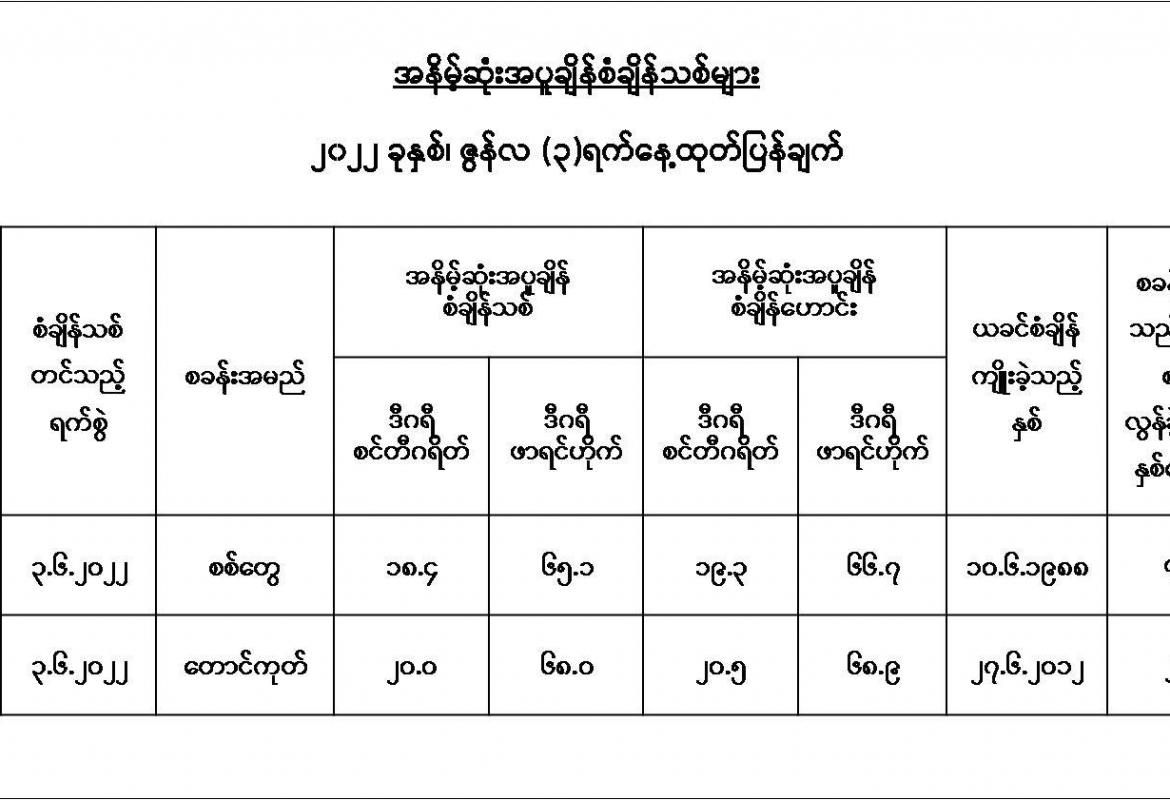ယနေ့ညနေအထိခန့်မှန်းချက်မှာ စစ်ကိုင်းတိုင်းဒေသကြီးအောက်ပိုင်းနှင့် မကွေးတိုင်းဒေသကြီးတို့တွင် နေရာကျဲကျဲ၊ နေပြည်တော်၊ မန္တလေးတိုင်းဒေသကြီး၊ ရှမ်းပြည်နယ်နှင့် ကယားပြည်နယ်တို့တွင် နေရာစိပ်စိပ်နှင့် ကျန်တိုင်းဒေသကြီးနှင့် ပြည်နယ်တို့တွင် နေရာအနှံ့အပြား မိုးထစ်ချုန်းရွာပြီး စစ်ကိုင်းတိုင်းဒေသကြီးအထက်ပိုင်း၊ ကချင်ပြည်နယ်နှင့် ရခိုင်ပြည်နယ်တို့တွင် နေရာကွက်၍ မိုးကြီးနိုင်သည်။ ရွာရန်ရာနှုန်းပြည့် ဖြစ်သည်။