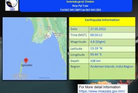ယနေ့ညနေအထိခန့်မှန်းချက်မှာ မကွေးတိုင်းဒေသကြီး၊ ရှမ်းပြည်နယ်(အရှေ့ပိုင်း)နှင့် ကယားပြည်နယ်တို့တွင် နေရာကျဲကျဲ၊ နေပြည်တော်၊ စစ်ကိုင်းတိုင်းဒေသကြီး၊ မန္တလေးတိုင်းဒေသကြီး၊ ပဲခူးတိုင်းဒေသကြီး၊ ရန်ကုန်တိုင်းဒေသကြီး၊ ဧရာဝတီတိုင်းဒေသကြီး၊ ရှမ်းပြည်နယ်(မြောက်ပိုင်းနှင့် တောင်ပိုင်း)နှင့် ချင်းပြည်နယ်တို့တွင် နေရာစိပ်စိပ်နှင့် ကျန်တိုင်းဒေသကြီးနှင့် ပြည်နယ်တို့တွင် နေရာအနှံ့အပြား မိုးထစ်ချုန်းရွာပြီး တနင်္သာရီတိုင်းဒေသကြီး၊ ရခိုင်ပြည်နယ်နှင့် မွန်ပြည်နယ်တို့တွင် နေရာကွက်၍ မိုးကြီးနိုင်သည်။ ရွာရန်ရာနှုန်းပြည့် ဖြစ်သည်။
