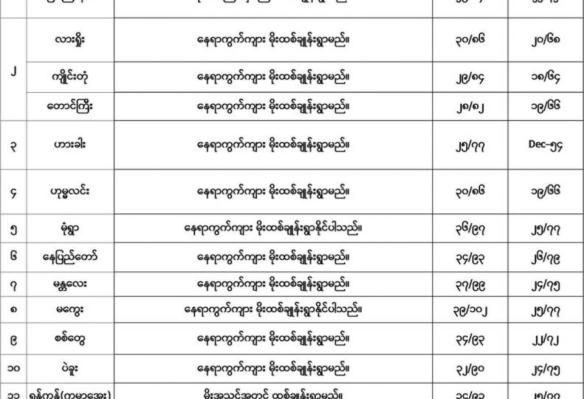 မနက်ဖြန်နံနက်အထိခန့်မှန်းချက်မှာ နေပြည်တော်နှင့် ကယားပြည်နယ်တို့တွင် နေရာကွက်ကျား၊ မကွေးတိုင်းဒေသကြီး၊ ရှမ်းပြည်နယ်(တောင်ပိုင်း)နှင့် ချင်းပြည်နယ်တို့တွင် နေရာကျဲကျဲ၊ စစ်ကိုင်းတိုင်းဒေသကြီးအောက်ပိုင်း၊ မန္တလေးတိုင်းဒေသကြီးနှင့် ရခိုင်ပြည်နယ်တို့တွင် နေရာစိပ်စိပ်နှင့် ကျန်တိုင်းဒေသကြီးနှင့် ပြည်နယ်တို့တွင် နေရာအနှံ့အပြား မိုးထစ်ချုန်းရွာပြီး ရန်ကုန်တိုင်းဒေသကြီး၊ ဧရာဝတီတိုင်းဒေသကြီး၊ တနင်္သာရီတိုင်းဒေသကြီး၊ ကချင်ပြည်နယ်နှင့် မွန်ပြည်နယ်တို့တွင် နေရာကွက်၍ မိုးကြီးနိုင်သည်။ ရွာရန်ရာနှုန်း(၈၀) ဖြစ်သည်။