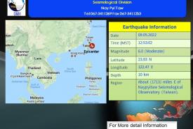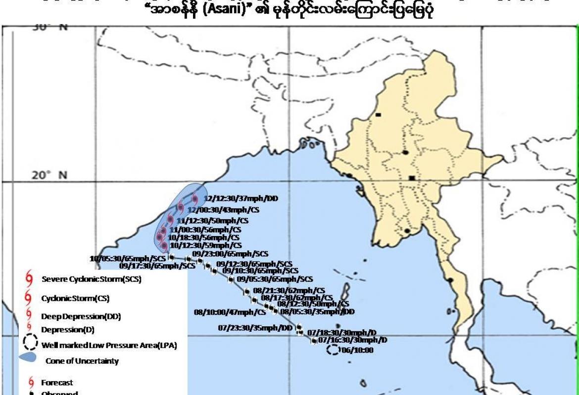 ဘင်္ဂလားပင်လယ်အော်အခြေအနေမှာ ယနေ့မြန်မာစံတော်ချိန် နံနက် ၅ နာရီခွဲ တိုင်းထွာချက်များအရ ဘင်္ဂလားပင်လယ်အော် အရှေ့တောင်ပိုင်းနှင့် ယင်းနှင့်ဆက်စပ်လျက်ရှိသော ဘင်္ဂလားပင်လယ်အော် အရှေ့အလယ်ပိုင်းတို့တွင် ဖြစ်ပေါ်နေသော အားကောင်းသောဆိုင်ကလုန်းမုန်တိုင်း(Severe Cyclonic Storm) “အာစန်နီ(Asani)”သည် အနောက်မြောက်ဘက်သို့ ရွေ့လျားခဲ့ပြီး ဘင်္ဂလားပင်လယ်အော် အနောက်အလယ်ပိုင်းနှင့် ယင်းနှင့်ဆက်စပ်လျက်ရှိသော ဘင်္ဂလားပင်လယ်အော်အရှေ့တောင်ပိုင်းသို့ ရောက်ရှိခဲ့ကာ အိန္ဒိယနိုင်ငံ ပို့ပလဲယား(Port Blair)၏ အနောက်-အနောက်မြောက်ဘက် ရေမိုင်(၃၄၀)မိုင်ခန့်၊ ဗီဆာကာပတ္တနမ်မြို့ (Vishakhapatnam) ၏ အရှေ့တောင်ဘက် ရေမိုင်(၃၄၅) မိုင်ခန့်၊ ပူရီမြို့(Puri)၏ တောင်-အရှေ့တောင်ဘက် ရေမိုင်(၃၉၅)မိုင်ခန့်၊ မြန်မာနိုင်ငံ ကိုကိုးကျွန်းမြို့ (Coco Island)၏ အနောက်-အနောက်တောင်ဘက် ရေမိုင် (၃၆၀)မိုင်ခန့်နှင့် ဟိုင်းကြီးကျွန်းမြို့ (Hainggyikyun)၏ အနောက်- အနောက်တောင်ဘက် ရေမိုင်(၄၄၅)မိုင်ခန့်အကွာ ပင်လယ်ပြင်ကို ဗဟိုပြုနေသည်။