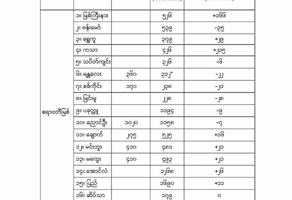 မနက်ဖြန်နံနက်အထိခန့်မှန်းချက်မှာ နေပြည်တော်၊ မကွေးတိုင်းဒေသကြီး၊ ပဲခူးတိုင်းဒေသကြီး၊ ရန်ကုန်တိုင်းဒေသကြီးနှင့် ဧရာဝတီတိုင်းဒေသကြီးတို့တွင် တိမ်အသင့်အတင့်ဖြစ်ထွန်းမည်။ ကချင်ပြည်နယ်တွင် နေရာအနှံ့အပြား၊ စစ်ကိုင်းတိုင်းဒေသကြီးအထက်ပိုင်းနှင့် တနင်္သာရီတိုင်းဒေသကြီး တို့တွင် နေရာစိပ်စိပ်၊ စစ်ကိုင်းတိုင်းဒေသကြီးအောက်ပိုင်း၊ မန္တလေးတိုင်းဒေသကြီးနှင့် ရှမ်းပြည်နယ် (မြောက်ပိုင်း)တို့တွင် နေရာကျဲကျဲနှင့် ကျန်တိုင်းဒေသကြီးနှင့် ပြည်နယ်တို့တွင် နေရာကွက်ကျား မိုးထစ်ချုန်းရွာမည်။ ရွာရန်ရာနှုန်း(၈၀) ဖြစ်သည်။