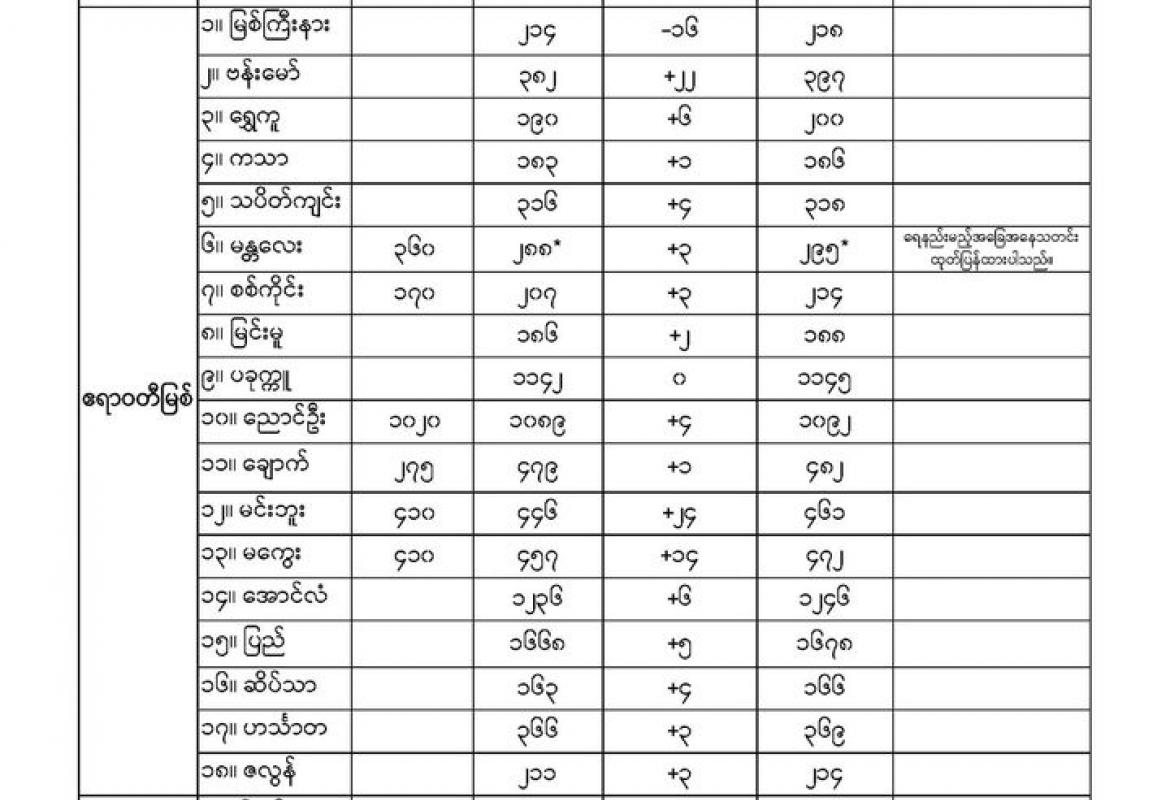 မနက်ဖြန်နံနက်အထိခန့်မှန်းချက်မှာ နေပြည်တော်၊ စစ်ကိုင်းတိုင်းဒေသကြီးအောက်ပိုင်း၊ မန္တလေးတိုင်း ဒေသကြီး၊ မကွေးတိုင်းဒေသကြီး၊ ပဲခူးတိုင်းဒေသကြီး၊ ရှမ်းပြည်နယ်နှင့် ရခိုင်ပြည်နယ်တို့တွင် နေရာအနှံ့အပြား၊ ရန်ကုန်တိုင်းဒေသကြီး၊ ဧရာဝတီတိုင်းဒေသကြီး၊ တနင်္သာရီတိုင်းဒေသကြီး၊ ကချင်ပြည်နယ်၊ ကယားပြည်နယ်၊ ကရင်ပြည်နယ်နှင့် မွန်ပြည်နယ်တို့တွင် နေရာစိပ်စိပ်နှင့် ကျန်တိုင်းဒေသကြီးနှင့် ပြည်နယ်တို့တွင် နေရာကျဲကျဲ မိုးထစ်ချုန်းရွာပြီး မန္တလေးတိုင်းဒေသကြီး၊ မကွေးတိုင်းဒေသကြီးနှင့် ရခိုင်ပြည်နယ်တို့တွင် ဒေသအလိုက်နှင့် နေပြည်တော်နှင့် ရှမ်းပြည်နယ် (တောင်ပိုင်းနှင့် အရှေ့ပိုင်း)တို့တွင် နေရာကွက်၍ မိုးကြီးနိုင်သည်။ ရွာရန်ရာနှုန်း(၈၀) ဖြစ်သည်။