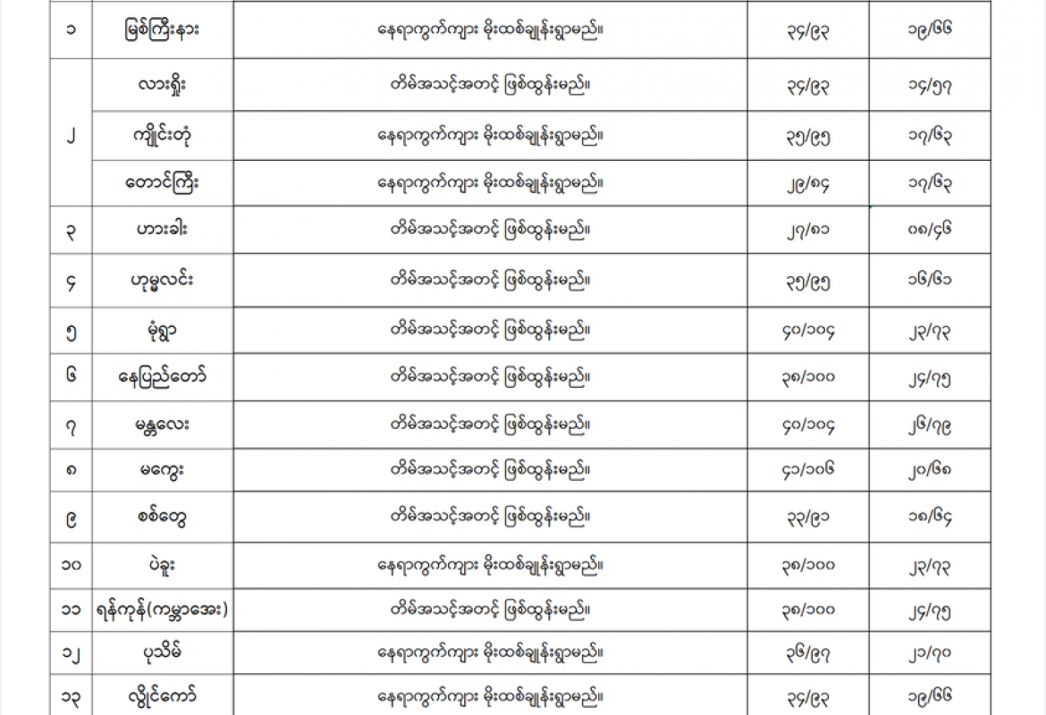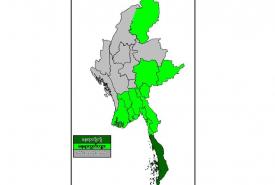 မနက်ဖြန်နံနက်အထိခန့်မှန်းချက်မှာ တနင်္သာရီတိုင်းဒေသကြီးတွင် နေရာကျဲကျဲနှင့် ပဲခူးတိုင်းဒေသကြီး၊ ရန်ကုန်တိုင်းဒေသကြီး၊ ဧရာဝတီတိုင်းဒေသကြီး၊ ကချင်ပြည်နယ်၊ ရှမ်းပြည်နယ် (တောင်ပိုင်းနှင့်အရှေ့ပိုင်း)၊ ကယားပြည်နယ်၊ ကရင်ပြည်နယ်နှင့် မွန်ပြည်နယ်တို့တွင်နေရာကွက်ကျား မိုးထစ်ချုန်းရွာမည်။ ရွာရန်ရာနှုန်း(၈၀) ဖြစ်သည်။ ကျန်တိုင်းဒေသကြီးနှင့် ပြည်နယ်တို့တွင် တိမ်အသင့်အတင့် ဖြစ်ထွန်းမည်။