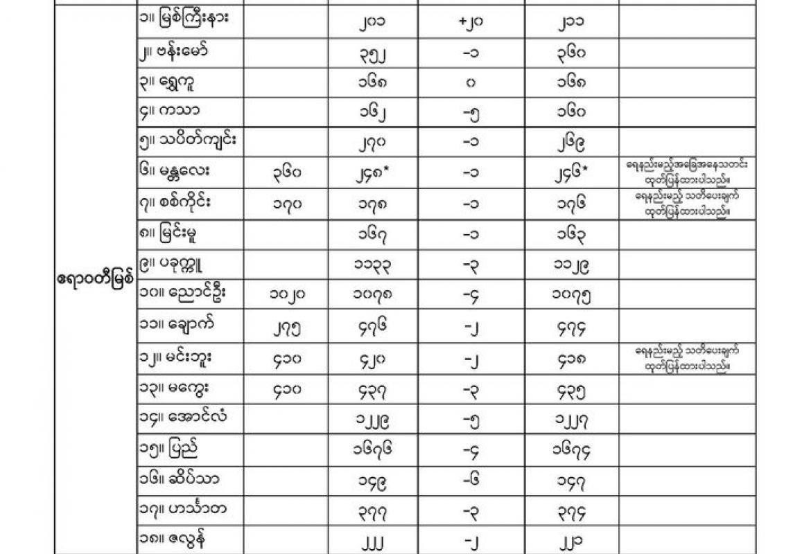 ယနေ့ညနေအထိ ခန့်မှန်းချက်မှာ တနင်္သာရီတိုင်းဒေသကြီးတွင် နေရာကျဲကျဲနှင့် စစ်ကိုင်းတိုင်း ဒေသကြီးအထက်ပိုင်း၊ ကချင်ပြည်နယ်နှင့် ရှမ်းပြည်နယ်(အရှေ့ပိုင်း)တို့တွင် နေရာကွက်ကျား မိုးထစ်ချုန်းရွာမည်။ ရွာရန်ရာနှုန်း(၈၀) ဖြစ်သည်။ ရှမ်းပြည်နယ်(မြောက်ပိုင်းနှင့် တောင်ပိုင်း)၊ ချင်းပြည်နယ်၊ ကရင်ပြည်နယ်နှင့် မွန်ပြည်နယ်တို့တွင် တိမ်အသင့်အတင့် ဖြစ်ထွန်းပြီး ကျန်တိုင်းဒေသကြီးနှင့် ပြည်နယ်တို့တွင် အများအားဖြင့် သာယာမည်။