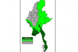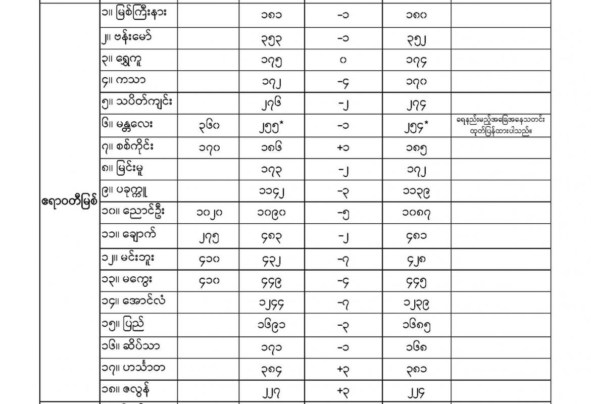 မနက်ဖြန်နံနက်အထိခန့်မှန်းချက်မှာ ရန်ကုန်တိုင်းဒေသကြီး၊ ဧရာဝတီတိုင်းဒေသကြီး၊ တနင်္သာရီတိုင်း ဒေသကြီး၊ ကရင်ပြည်နယ်နှင့် မွန်ပြည်နယ်တို့တွင် နေရာကျဲကျဲနှင့် နေပြည်တော်၊ ပဲခူးတိုင်းဒေသကြီး၊ ကချင်ပြည်နယ်၊ ရှမ်းပြည်နယ်၊ ရခိုင်ပြည်နယ်နှင့် ကယားပြည်နယ်တို့တွင် နေရာကွက်ကျား မိုးထစ်ချုန်းရွာမည်။ ရွာရန်ရာနှုန်း(၈၀) ဖြစ်သည်။ ကျန်တိုင်းဒေသကြီးနှင့် ပြည်နယ်တို့တွင် တိမ်အသင့်အတင့် ဖြစ်ထွန်းမည်။