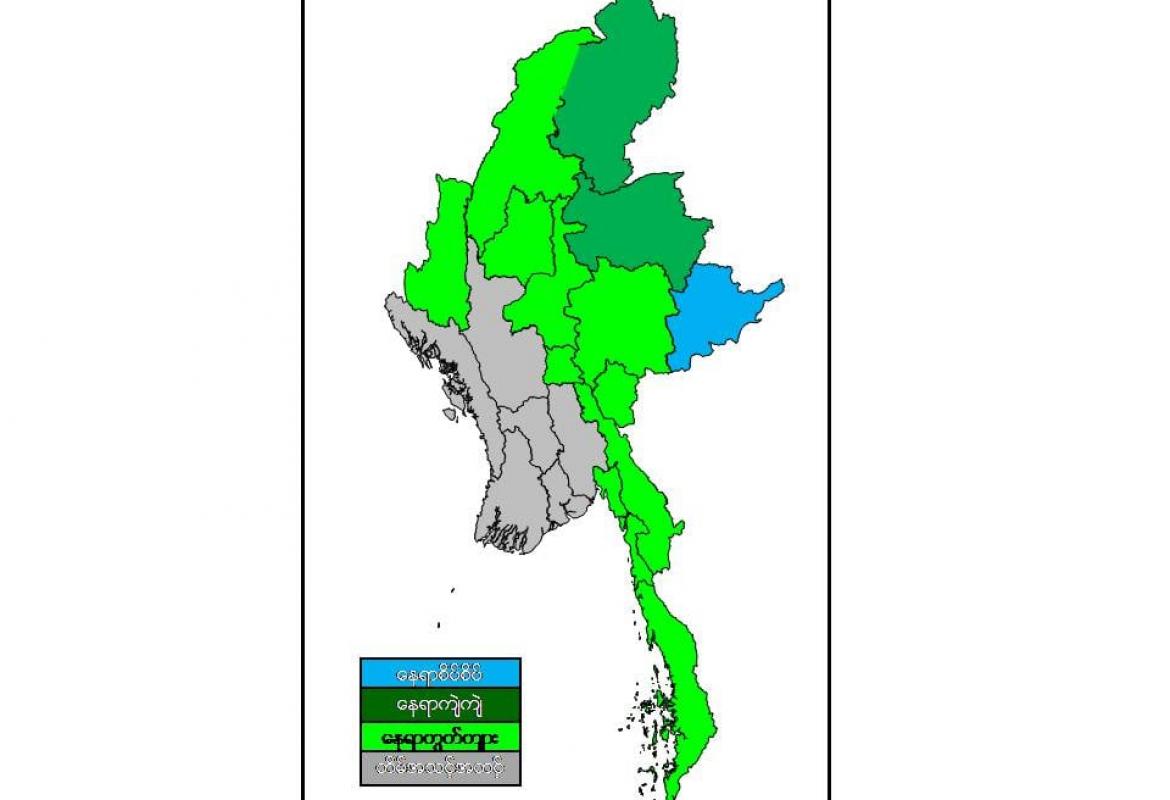 မနက်ဖြန်နံနက်အထိခန့်မှန်းချက်မှာ ရှမ်းပြည်နယ်(အရှေ့ပိုင်း)တွင် နေရာစိပ်စိပ်၊ ကချင်ပြည်နယ်နှင့် ရှမ်းပြည်နယ်(မြောက်ပိုင်း)တို့တွင် နေရာကျဲကျဲနှင့် နေပြည်တော်၊ စစ်ကိုင်းတိုင်းဒေသကြီး၊ မန္တလေးတိုင်းဒေသကြီး၊ ရှမ်းပြည်နယ်(တောင်ပိုင်း)၊ ချင်းပြည်နယ်၊ ကယားပြည်နယ်၊ ကရင်ပြည်နယ်နှင့် မွန်ပြည်နယ်တို့တွင် နေရာကွက်ကျား မိုးထစ်ချုန်းရွာမည်။ ရွာရန်ရာနှုန်း(၈၀) ဖြစ်သည်။ ကျန်တိုင်းဒေသကြီးနှင့် ပြည်နယ်တို့တွင်တိမ်အသင့်အတင့် ဖြစ်ထွန်းမည်။