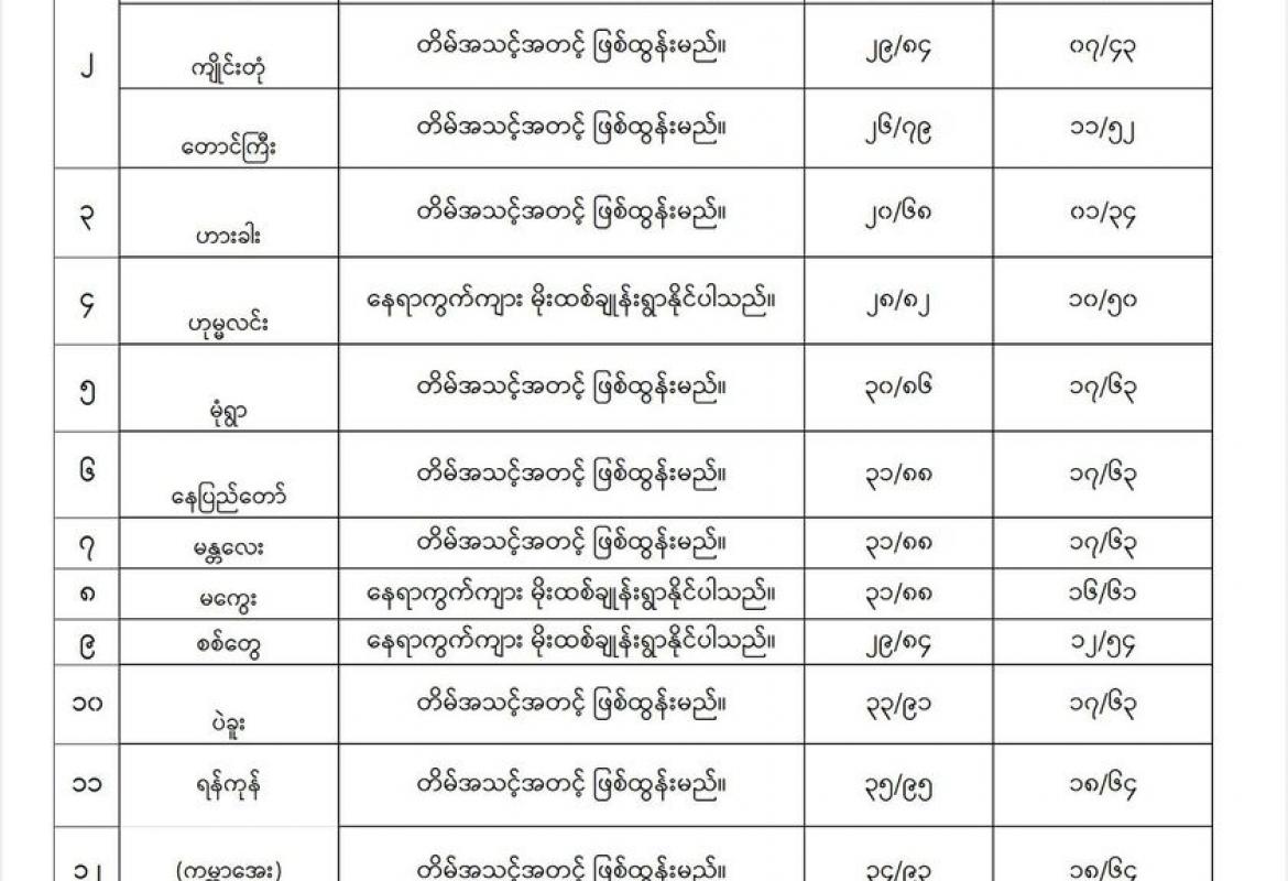 မနက်ဖြန်နံနက်အထိခန့်မှန်းချက်မှာ စစ်ကိုင်းတိုင်းဒေသကြီးအထက်ပိုင်း၊ မကွေးတိုင်းဒေသကြီး၊ တနင်္သာရီတိုင်းဒေသကြီး၊ ကချင်ပြည်နယ်နှင့် ရခိုင်ပြည်နယ်တို့တွင် နေရာကွက်ကျား မိုးထစ်ချုန်းရွာနိုင်သည်။ ရွာရန်ရာနှုန်း(၆၀) ဖြစ်သည်။ ကျန်တိုင်းဒေသကြီးနှင့် ပြည်နယ်တို့တွင် တိမ်အသင့်အတင့် ဖြစ်ထွန်းမည်။