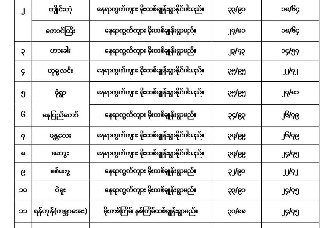 လွန်ခဲ့သော(၂၄)နာရီအတွင်းက စစ်ကိုင်းတိုင်းဒေသကြီး၊ မကွေးတိုင်းဒေသကြီး၊ ကချင်ပြည်နယ်၊ ရှမ်းပြည်နယ်(အရှေ့ပိုင်း)နှင့် ကယားပြည်နယ်တို့တွင် တိမ်အသင့်အတင့် ဖြစ်ထွန်းခဲ့ပြီး နေပြည်တော်နှင့် မန္တလေးတိုင်းဒေသကြီးတို့တွင် နေရာကွက်ကျား၊ ပဲခူးတိုင်းဒေသကြီး၊ ရှမ်းပြည်နယ်(မြောက်ပိုင်းနှင့် တောင်ပိုင်း)၊ ရခိုင်ပြည်နယ်နှင့် ကရင်ပြည်နယ်တို့တွင်နေရာကျဲကျဲ၊ ရန်ကုန်တိုင်းဒေသကြီး၊ ဧရာဝတီတိုင်းဒေသကြီးနှင့် ချင်းပြည်နယ်တို့တွင် နေရာစိပ်စိပ်နှင့် ကျန်တိုင်းဒေသကြီးနှင့် ပြည်နယ်တို့တွင်နေရာအနှံ့အပြား မိုးထစ်ချုန်းရွာခဲ့ကာ၊ တနင်္သာရီတိုင်းဒေသကြီးတွင် နေရာကွက်၍ မိုးကြီးခဲ့သည်။