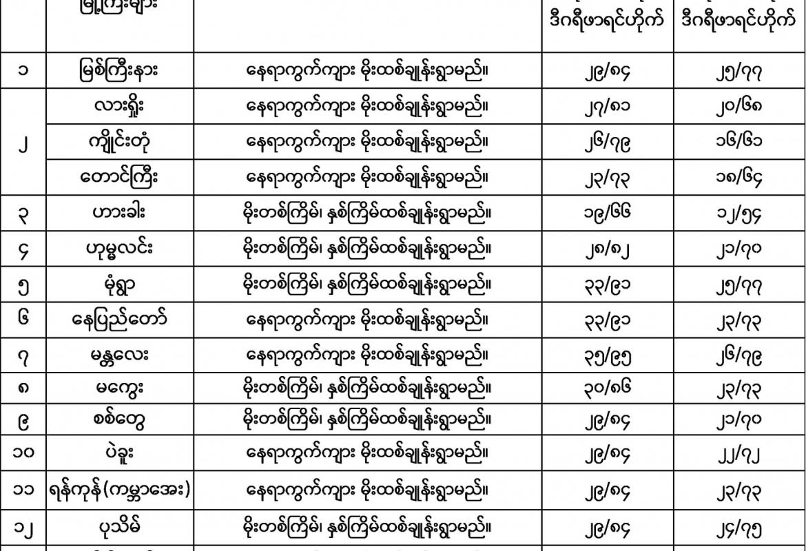 အောက်မှာဖော်ပြထားတာကတော့ မနက်ဖြန်အတွက် တိုင်းဒေသကြီးနှင့် ပြည်နယ်များရှိ မြို့ကြီးများ၏ အမြင့်ဆုံးအပူချိန်၊ အနိမ့်ဆုံးအပူချိန်နှင့် မိုးလေဝသခန့်မှန်းချက်တို့ပဲဖြစ်ပါတယ်။