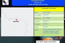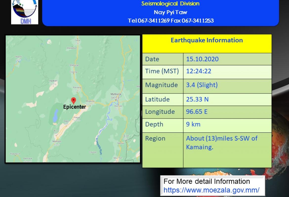 ၂၀၂၀ ပြည့်နှစ်၊ အောက်တိုဘာလ (၁၅)ရက်နေ့၊ မြန်မာစံတော်ချိန် (၁၂)နာရီ၊ (၂၄)မိနစ်၊ (၂၂) စက္ကန့်အချိန်တွင် မြစ်ကြီးနားမြေငလျင်စခန်းမှ အနောက်-အနောက်တောင်ဘက် (၅၃)မိုင်ခန့် ကွာဝေး သော၊ မြန်မာနိုင်ငံပြည်တွင်း (ကာမိုင်းမြို့၏ တောင်-အနောက်တောင်ဘက် (၁၃)မိုင်ခန့်အကွာ)၊ မြောက်လတ္တီတွဒ် (၂၅.၃၃) ဒီဂရီ၊ အရှေ့လောင်ဂျီတွဒ် (၉၆.၆၅)ဒီဂရီ၊ အနက် (၉)ကီလိုမီတာကို ဗဟိုပြု၍ အင်အားရစ်(ခ်)တာစကေး (၃.၄)အဆင့်ရှိ အင်အားအနည်းငယ်ရှိသော မြေငလျင်တစ်ခု လှုပ်ရှားသွားကြောင်း တိုင်းထွာ