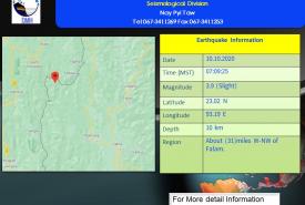 ၂၀၂၀ ပြည့်နှစ်၊ အောက်တိုဘာလ (၁၀) ရက်နေ့၊ မြန်မာစံတော်ချိန် (၀၇) နာရီ၊ (၀၉) မိနစ်၊ (၂၅) စက္ကန့် အချိန်တွင် ဟားခါးမြေငလျင်စခန်းမှ အနောက်မြောက်ဘက် (၃၇)မိုင်ခန့်ကွာဝေးသော ...............