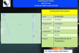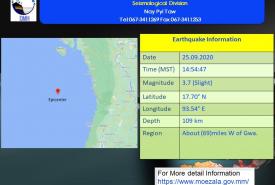 ၂၀၂၀ ပြည့်နှစ်၊ စက်တင်ဘာလ (၂၅) ရက် မြန်မာစံတော်ချိန် မွန်းလွဲ ၂ နာရီ ၅၄ မိနစ်၊ ၄၇ စက္ကန့်တွင် ဂွမြေငလျင်စခန်းမှ အနောက်ဘက် (၆၉)မိုင် ခန့်ကွာဝေးသော မြန်မာနိုင်ငံပြည်တွင်း (မြန်မာ့ပင်လယ်ပြင်)၊