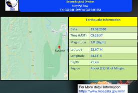 ၂၀၂၀ ပြည့်နှစ်၊ ဩဂုတ်လ (၂၃)ရက်နေ့၊ မြန်မာစံတော်ချိန် (၀၅)နာရီ၊ (၂၆)မိနစ်၊ (၃၇)စက္ကန့် အချိန်တွင် ဟားခါးမြေငလျင်စခန်းမှ အရှေ့ဘက် (၆၄)မိုင် ခန့်ကွာဝေးသော မြန်မာနိုင်ငံ ပြည်တွင်း