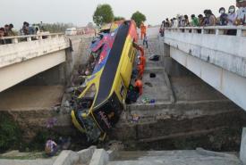 အမြန်လမ်းတွင် ခရီးသည်တင်ယာဉ်(၁)စီး ရှေ့ဝဲဘက်ဘီးပေါက်၍ ရေမြောင်းအတွင်းသို့ ထိုးကျတိမ်းမှောက်