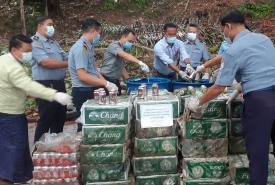 ကော့သောင်းမြို့တွင် အကောက်အခွန်မဲ့ သိမ်းဆည်းရမိသည့် ဘီယာများအား ဖျက်ဆီး
