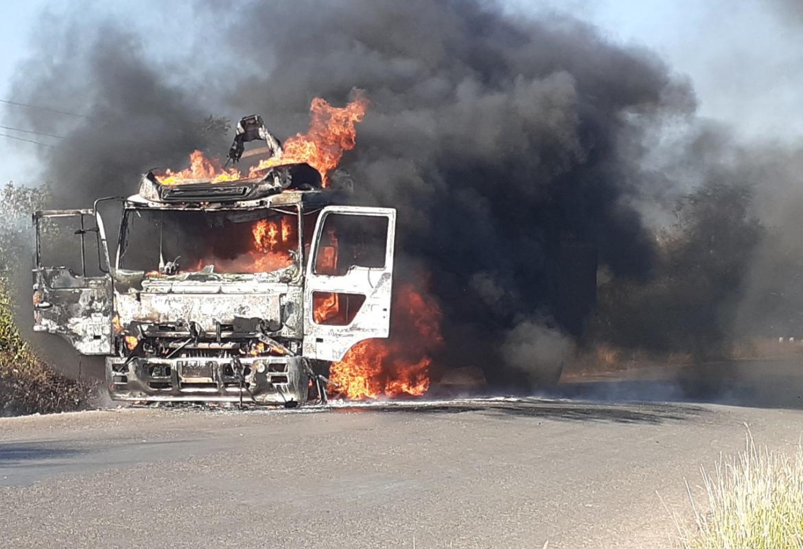 လှိုင်းဘွဲမြို့နယ် ထီလုံ-ဘားအံသွား ကားလမ်းမပေါ်တွင် ဝါယာရှော့ဖြစ်၍ ကုန်တင်ယာဉ်တစ်စီး မီးလောင်မှု ဖြစ်ပွား