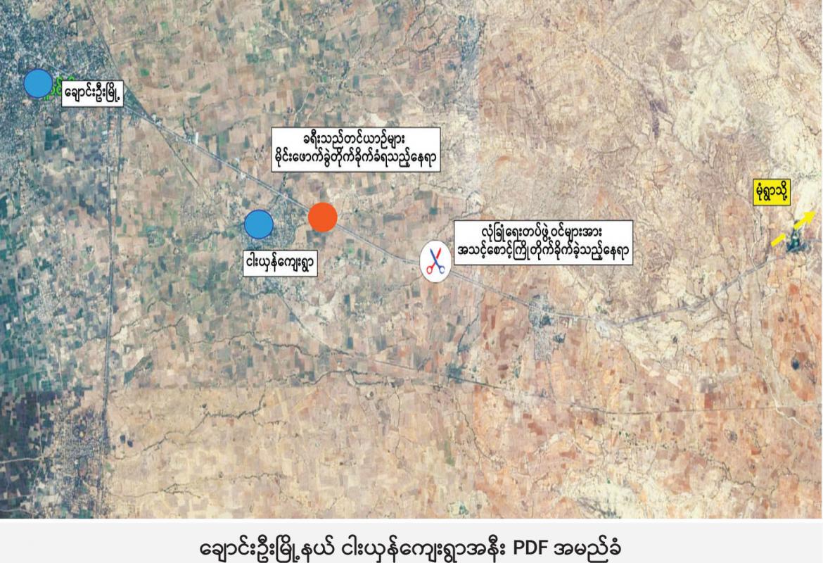 ရန်ကုန်မြို့မှ မုံရွာမြို့သို့ မောင်းနှင်ထွက်ခွာလာသည့် ခရီးသည်တင်ယာဉ်များအား ချောင်းဦးမြို့နယ် ငါးယှန်ကျေးရွာအနီး၌ PDF အမည်ခံအကြမ်းဖက်သမားများက လက်လုပ်မိုင်းများဖြင့်ဖောက်ခွဲတိုက်ခိုက်ပြီး လက်နက်ငယ်များဖြင့် ပစ်ခတ်တိုက်ခိုက်၊ ခရီးသွားပြည်သူ တစ်ဦးသေဆုံး၊ သ