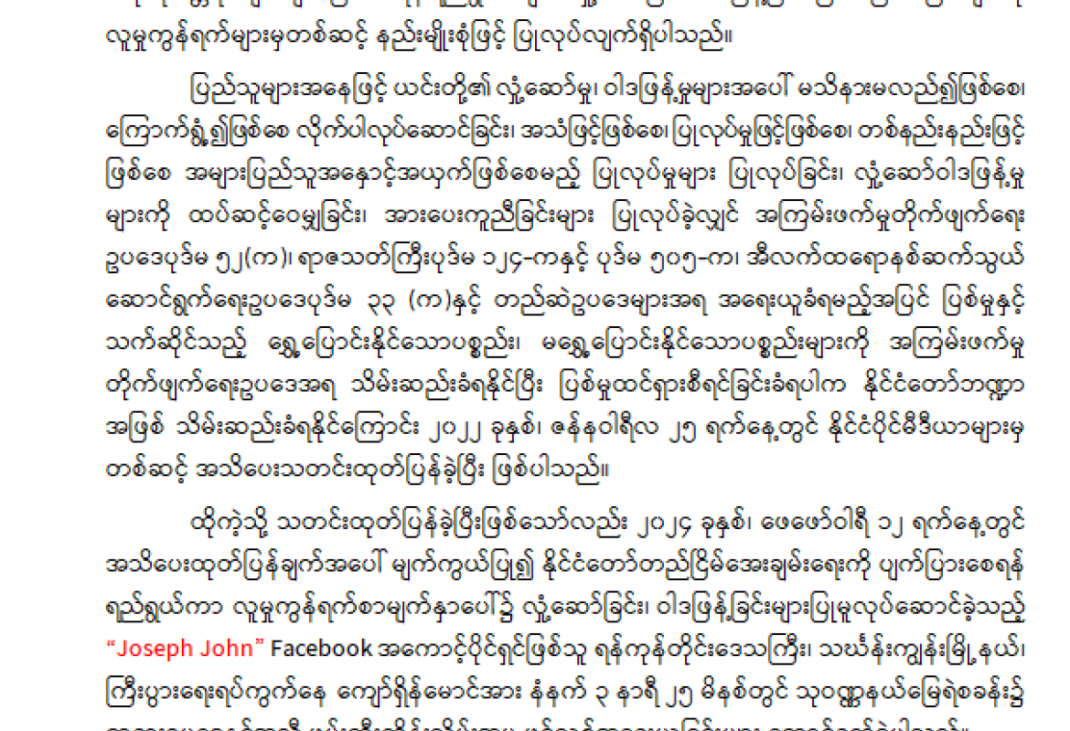 အကြမ်းဖက်အုပ်စုအဖြစ် ကြေညာထားသော CRPH၊ NUG နှင့် ၎င်းတို့၏ လက်ဝေခံများ၏ လှုံ့ဆော်၊ ဝါဒဖြန့်ခြင်းများအား လိုက်ပါလုပ်ဆောင်ခြင်း၊ အားပေးကူညီခြင်းများ ပြုလုပ်ခဲ့သူများအား ဖော်ထုတ်အရေးယူ