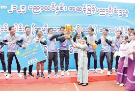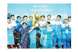 ပြည်ထောင်စု၀န်ကြီး ဒေါက်တာချောချောစိန် တက္ကသိုလ်ပေါင်းစုံ (အမျိုးသား၊ အမျိုးသမီး) ဘောလုံးပြိုင်ပွဲ ဗိုလ်လုပွဲ တက်ရောက်ဆုချီးမြှင့်