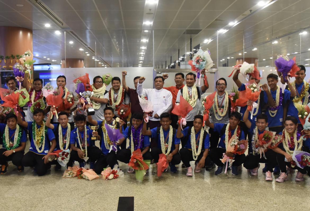 ဟောင်ကောင်ဘောလုံးအဖွဲ့ချုပ်က ကြီးမှူးကျင်းပသည့် ဟောင်ကောင် ယူ-၁၈ ဖိတ်ခေါ်ပြိုင်ပွဲတွင် ဗိုလ်စွဲခဲ့သည့် မြန်မာ ယူ-၁၈ အသင်းသည် ယနေ့ညနေပိုင်းက ရန်ကုန်မြို့သို့ ပြန်လည်ရောက်ရှိလာရာ မြန်မာနိုင်ငံဘောလုံးအဖွဲ့ချုပ်မှ တာဝန်ရှိသူများ၊ ဆွေမျိုးမိတ်သင်္ဂဟများက ရန်ကုန်အပြည်ပြည်ဆိုင်ရာ လေဆိပ်တွင် ကြိုဆိုနှုတ်ဆက်သည်။