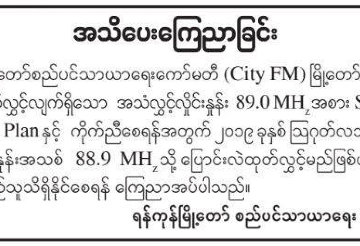 CITY FM လှိုင်းနှုန်းအသစ်ဖြင့် ပြောင်းလဲထုတ်လွှင့်