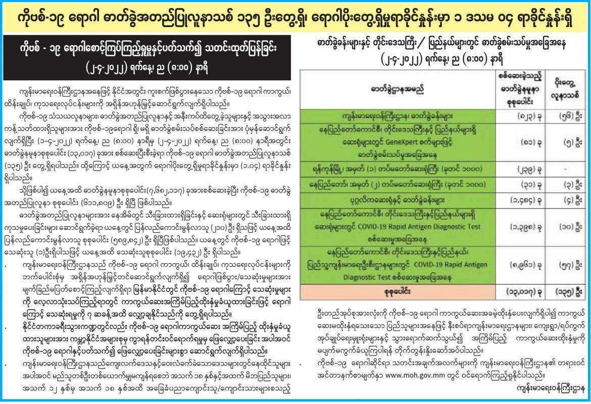 ကိုဗစ်-၁၉ ရောဂါ ဓာတ်ခွဲအတည်ပြုလူနာသစ် ၁၇၃ ဦးတွေ့ရှိ၊ ရောဂါပိုးတွေ့ရှိမှုရာခိုင်နှုန်းမှာ ၁ ဒသမ ၁ ရာခိုင်နှုန်းရှိ