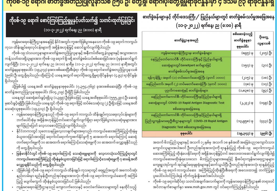 ကိုဗစ်-၁၉ ရောဂါ ဓာတ်ခွဲအတည်ပြုလူနာသစ် ၉၅၆ ဦး တွေ့ရှိ၊ ရောဂါပိုးတွေ့ရှိမှုရာခိုင်နှုန်းမှာ ၄ ဒသမ ၉၃ ရာခိုင်နှုန်းရှိ
