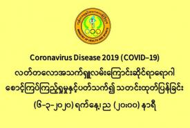 ကျန်းမာရေးနှင့် အားကစားဝန်ကြီးဌာန၊ ကသာခရိုင်ကျန်းမာရေးဦးစီးဌာနမှ COVID 19 ရောဂါကာကွယ်ရေးနှင့် စောင့်ကြပ်ကြည့်ရှုခြင်းလုပ်ငန်းများ ပိုမိုဆောင်ရွက်နိုင်ရန်ရည်ရွယ်၍ ကသာမြို့ရှိ ဘဏ်၊ စက်ရုံ၊ အလုပ်ရုံများနှင့် စားသောက်ဆိုင်များမှ တာဝန်ရှိသူများနှင့် ဝန်ထမ်းများအား COVID 19 ရောဂါအကြောင်း အသိပေးဆွေးနွေးခြင်းကို ယမန်နေ့က ကသာပြည်သူ့ဆေးရုံ အစည်းအဝေးခန်းမတွင် ပြုလုပ်ခဲ့သည်။