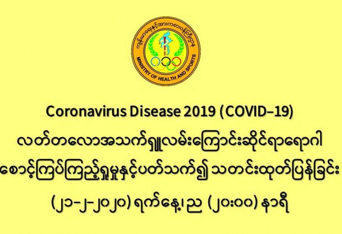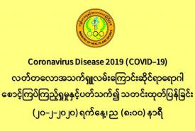 ကျန်းမာရေးနှင့်အားကစားဝန်ကြီးဌာနသည် တရုတ်ပြည်သူ့သမ္မတနိုင်ငံနှင့် ကမ္ဘာ့နိုင်ငံအချို့တွင် ကူးစက်ပျံ့နှံ့လျက်ရှိသည့် COVID-19 လတ်တလောအသက်ရှူလမ်းကြောင်းဆိုင်ရာ ရောဂါ ဖြစ်ပွားမှုဖြစ်စဉ်နှင့်ပတ်သက်၍ ရောဂါစောင့်ကြပ်ကြည့်ရှုခြင်း လုပ်ငန်းများအား အပြည်ပြည်ဆိုင်ရာ ဝင်ပေါက်၊ ထွက်ပေါက်ဂိတ်များတွင်လည်းကောင်း၊