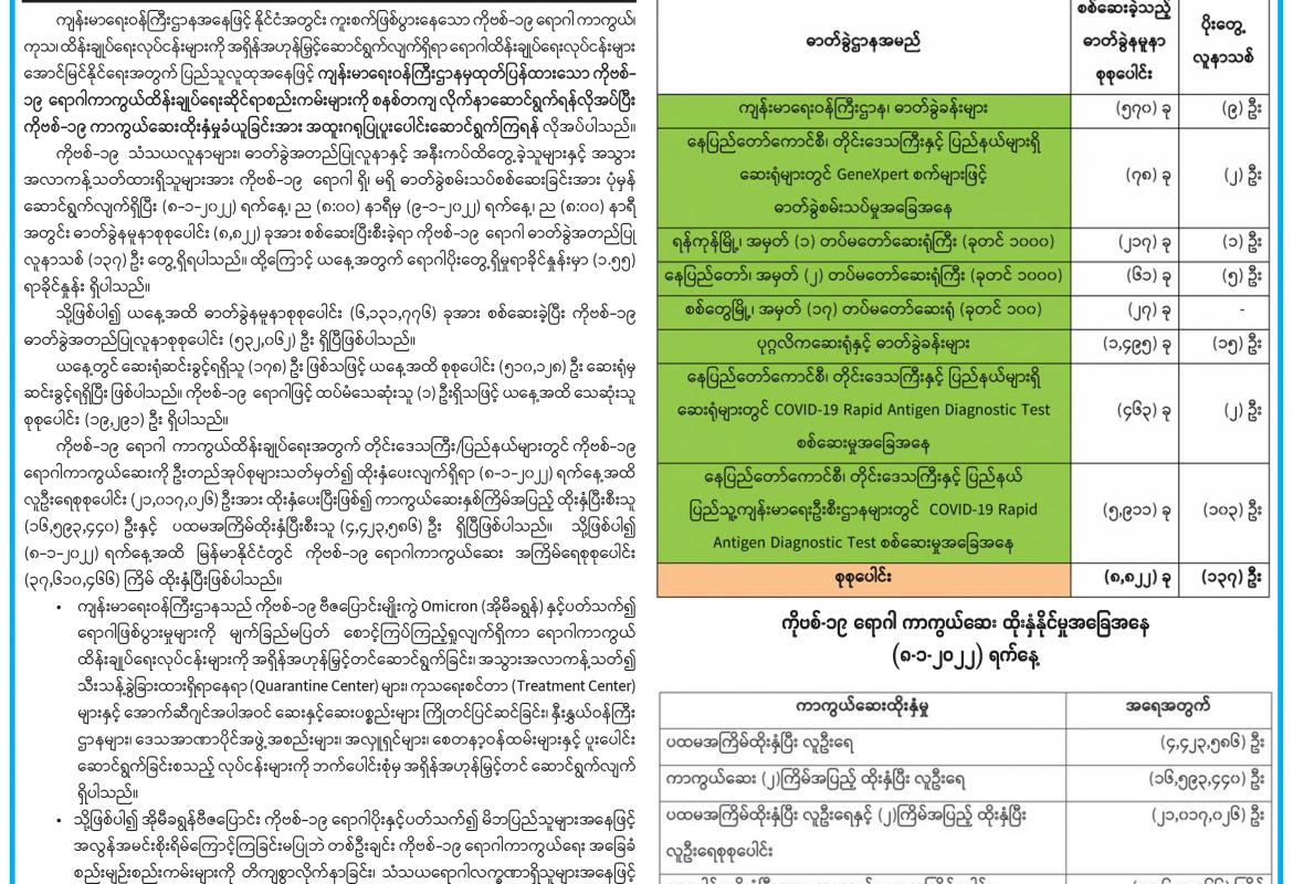 ကိုဗစ်-၁၉ ရောဂါ ဓာတ်ခွဲအတည်ပြုလူနာသစ် ၁၁၀ တွေ့ရှိ၊ ရောဂါပိုးတွေ့ရှိမှုရာခိုင်နှုန်းမှာ ၁ ဒသမ ၄၆ ရာခိုင်နှုန်းရှိ