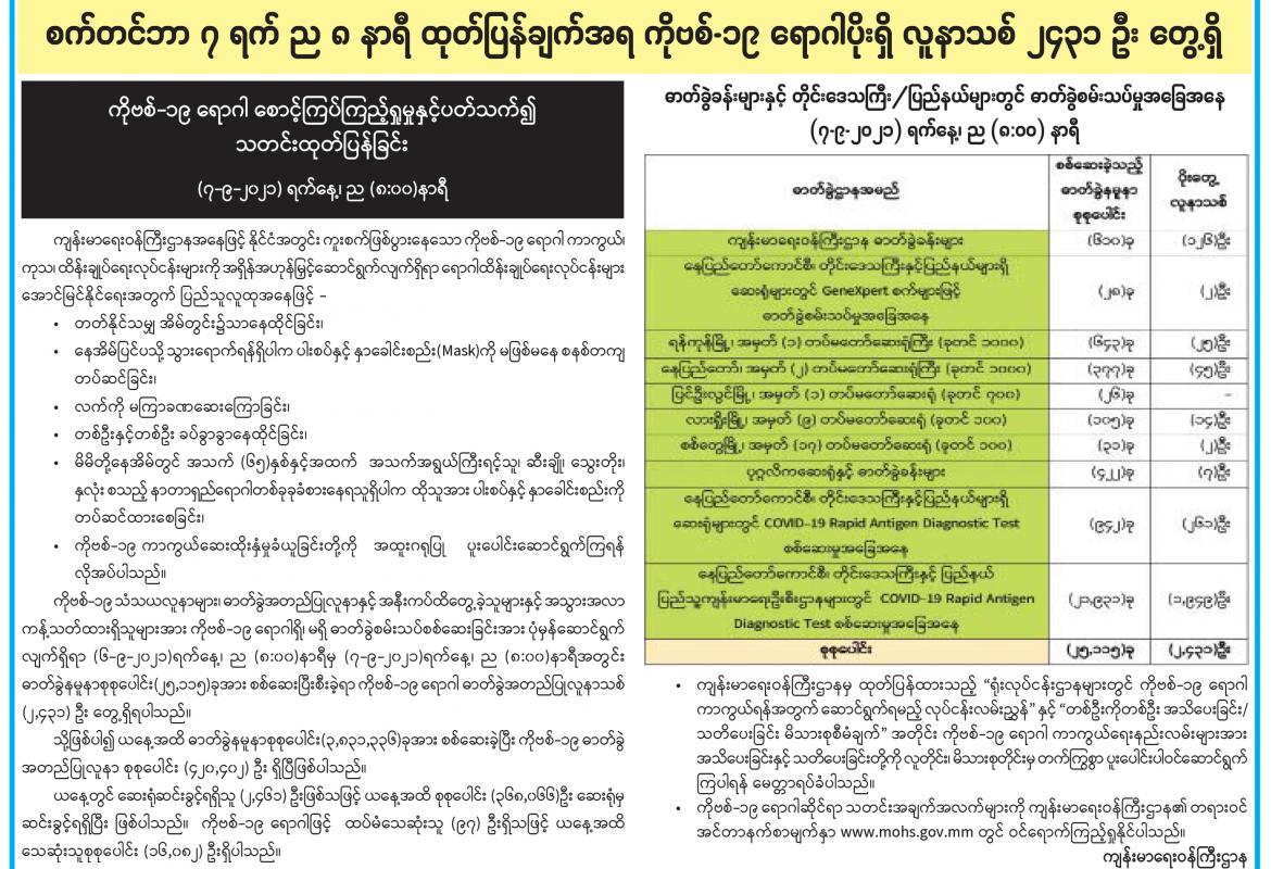 စက်တင်ဘာ ၇ ရက် ည ၈ နာရီ ထုတ်ပြန်ချက်အရ ကိုဗစ်-၁၉ ရောဂါပိုးရှိ လူနာသစ် ၂၄၃၁ ဦး တွေ့ရှိ