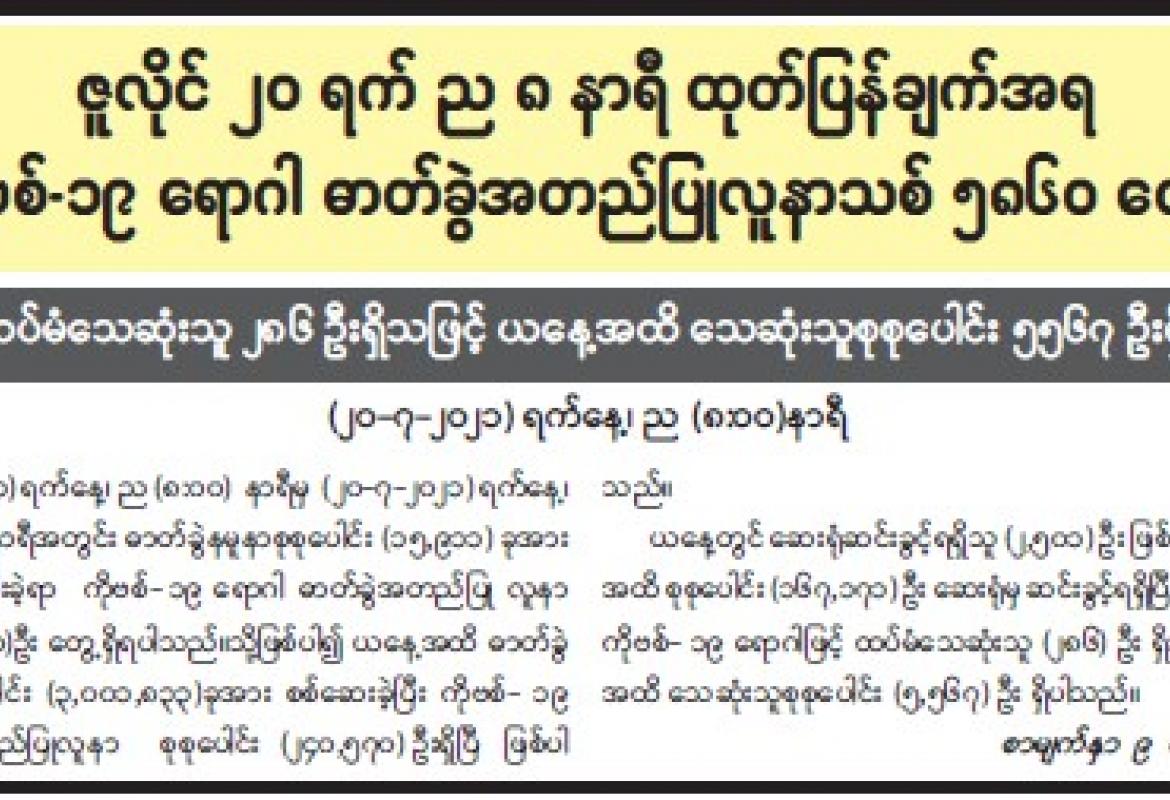 ဇူလိုင်လ ၂၀ ရက် ည ၈ နာရီ ထုတ်ပြန်ချက်အရ ကိုဗစ်-၁၉ ရောဂါ ဓာတ်ခွဲအတည်ပြုလူနာသစ် ၅၈၆၀ ဦးရှိ