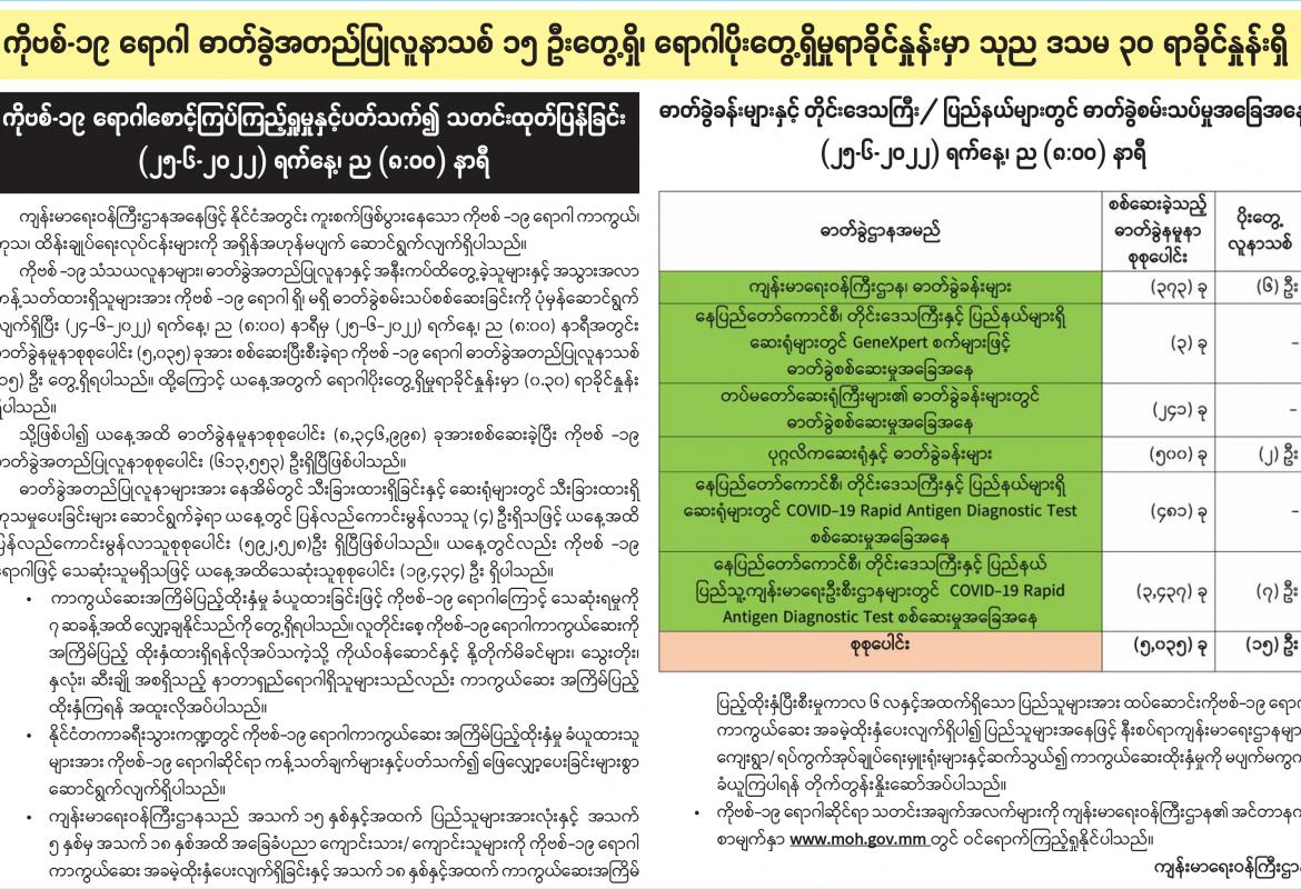 COVID-19 ရောဂါစောင့်ကြပ်ကြည့်ရှုမှုနှင့်ပတ်သက်၍ သတင်းထုတ်ပြန်ခြင်း (၉-၆-၂၀၂၂) ရက်နေ့၊ ည (၈:၀၀) နာရီ