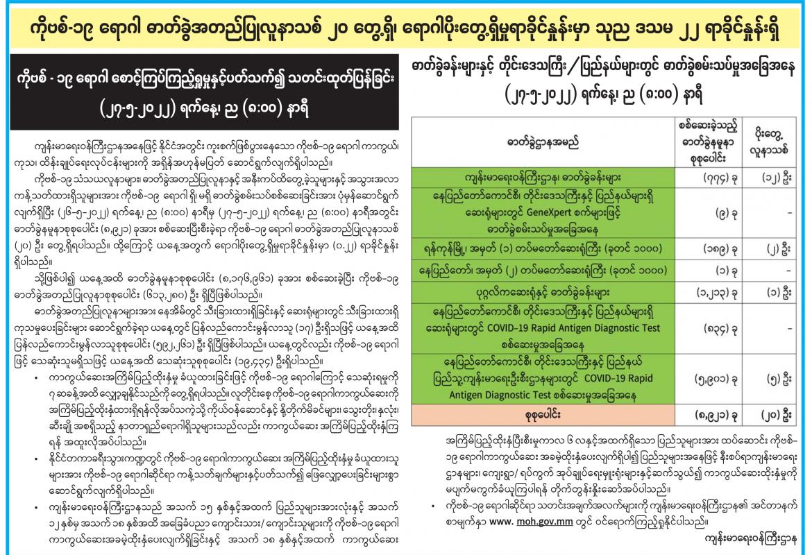 ကိုဗစ်-၁၉ ရောဂါ ဓာတ်ခွဲအတည်ပြုလူနာသစ် ၂၀ တွေ့ရှိ၊ ရောဂါပိုးတွေ့ရှိမှုရာခိုင်နှုန်းမှာ သုည ဒသမ ၂၂ ရာခိုင်နှုန်းရှိ