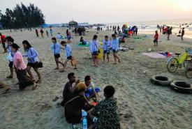 ငပလီကမ်းခြေတွင် သင်္ကြန်အကြတ်နေ့၌ အနယ်နယ်အရပ်ရပ်မှ ခရီးသွားပြည်သူများ၊ ကမ္ဘာလှည့်ခရီးသွား ဧည့်သည်များ၊ ဒေသခံပြည်သူများဖြင့် စည်ကားလျက်ရှိနေ