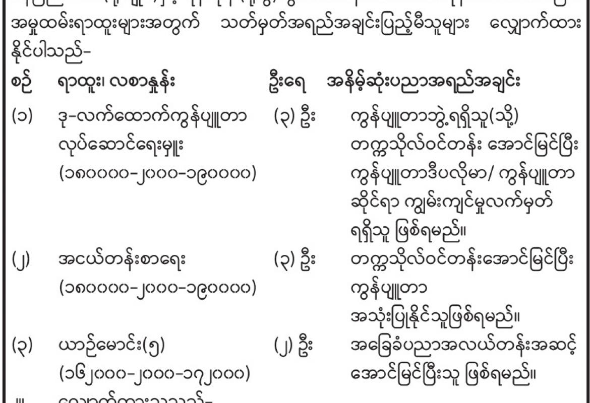ပြန်ကြားရေးဝန်ကြီးဌာန၊ ပုံနှိပ်ရေးနှင့်ထုတ်ဝေရေးဦးစီးဌာန၊ လျှောက်လွှာခေါ်ယူ