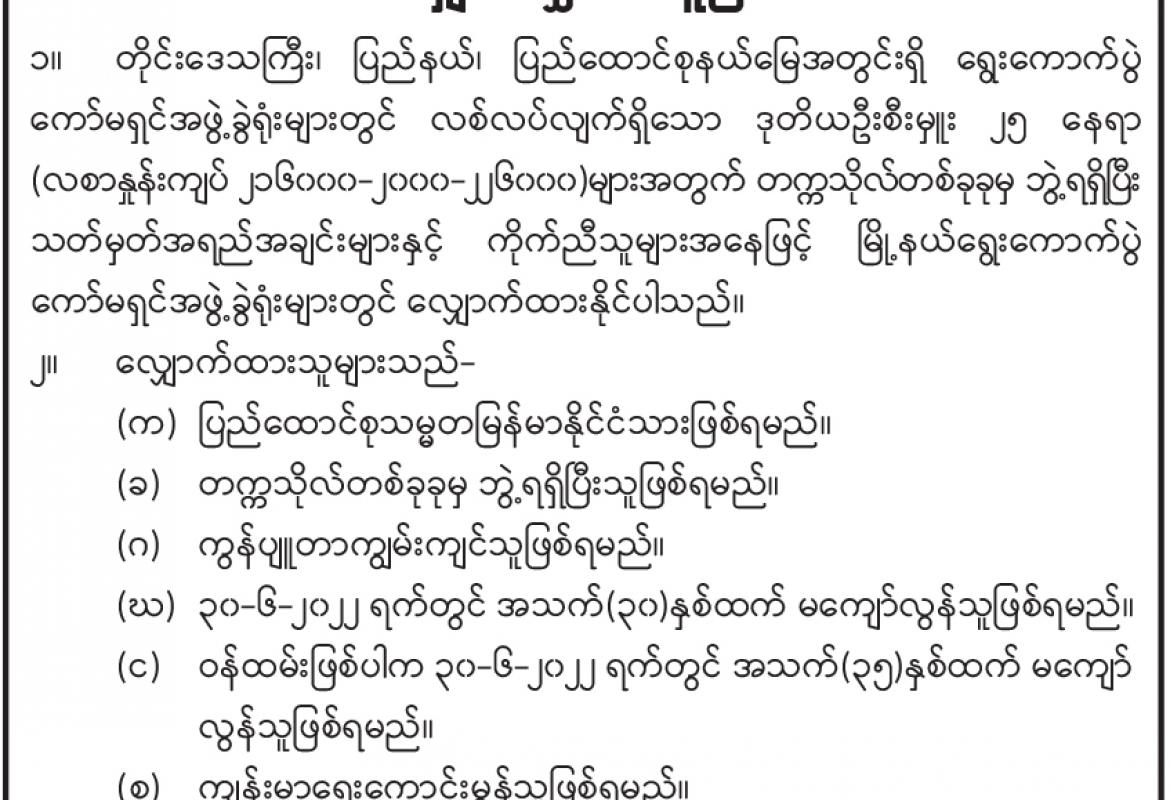 တိုင်းဒေသကြီး၊ ပြည်နယ်၊ ပြည်ထောင်စုနယ်မြေအတွင်းရှိ ရွေးကောက်ပွဲကော်မရှင် အဖွဲ့ခွဲရုံးများတွင် လစ်လပ်လျက်ရှိသော ဒုတိယဦးစီးမှူးရာထူးနေရာများအတွက် လျှောက်လွှာခေါ်ယူ
