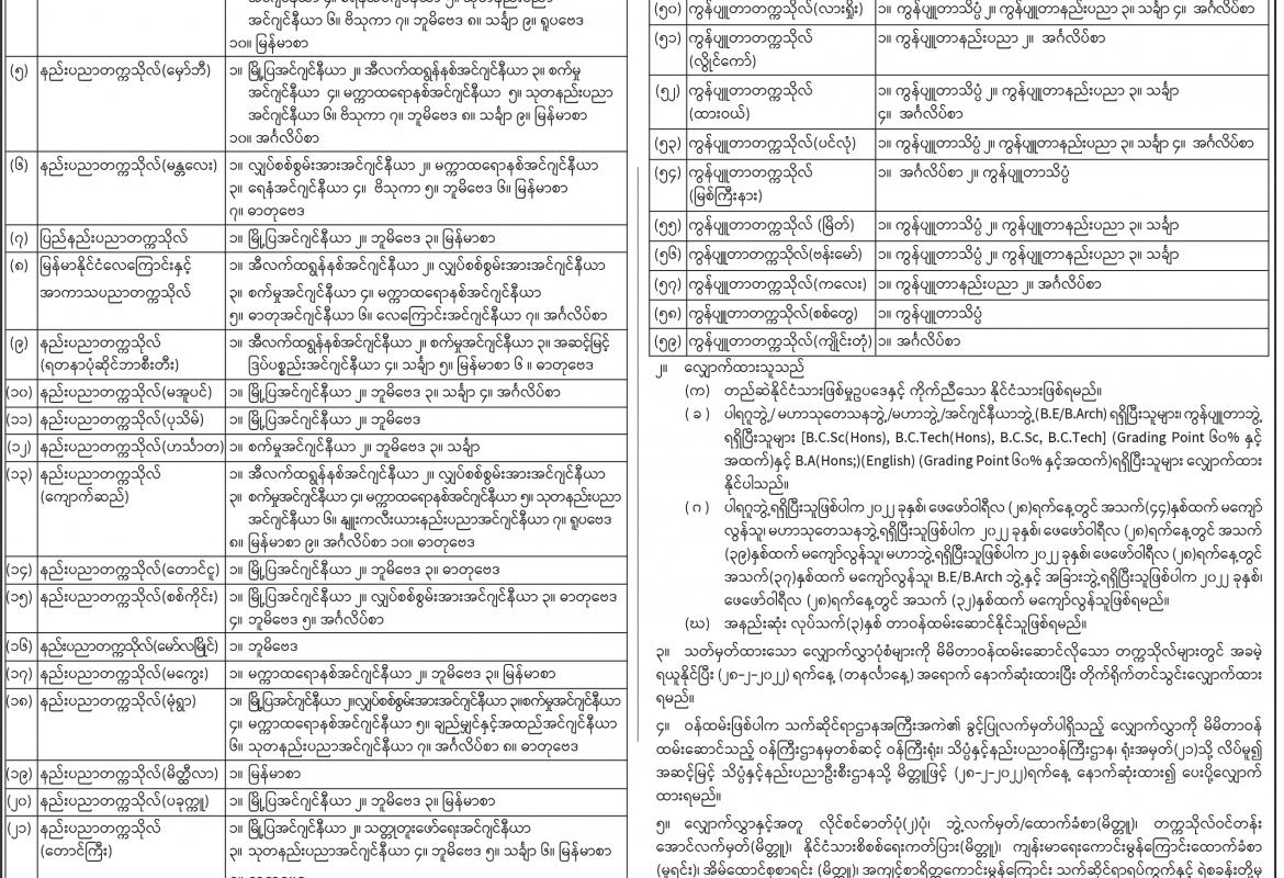 မန္တလေးတိုင်းဒေသကြီး၊ ပတ်ဝန်းကျင်ထိန်းသိမ်းရေးဦးစီးဌာနတွင် လစ်လပ်လျက်ရှိသော အောက်ဖော်ပြပါ ရာထူးနေရာများအတွက် သတ်မှတ်အရည်အချင်းများနှင့် ကိုက်ညီသူများ လျှောက်ထားနိုင်