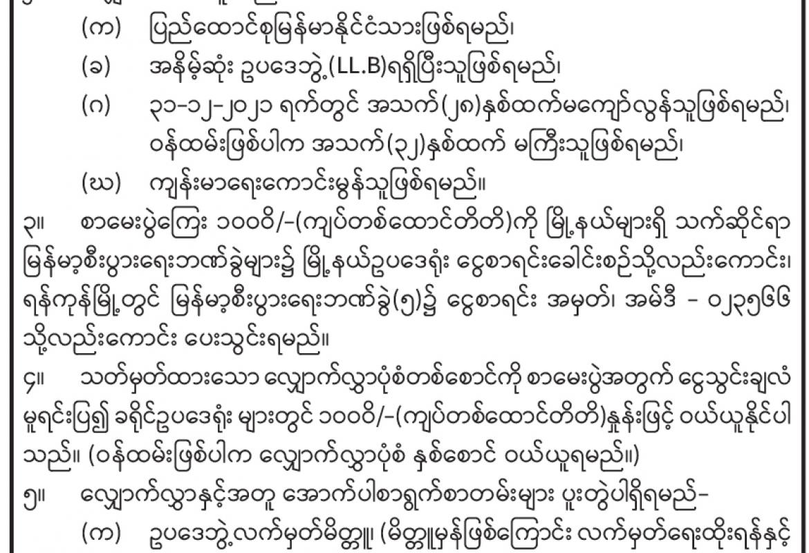 ဥပဒေရေးရာဝန်ကြီးဌာနနှင့် ဥပဒေရုံးအဆင့်ဆင့်တို့တွင် တာဝန်ထမ်းဆောင်ရန် အမျိုးသား ၅၀ ၊ အမျိုးသမီး ၅၀ ခေါ်ယူ