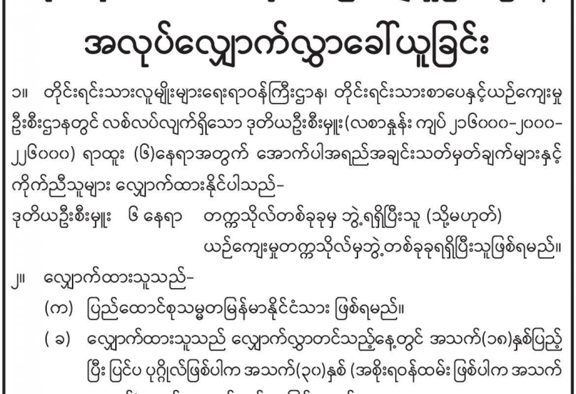 တိုင်းရင်းသားလူမျိုးရေးရာဝန်ကြီးဌာန တိုင်းရင်းသားစာပေနှင့် ယဉ်ကျေးမှုဦးစီးဌာန အလုပ်လျှောက်လွှာခေါ်ယူ