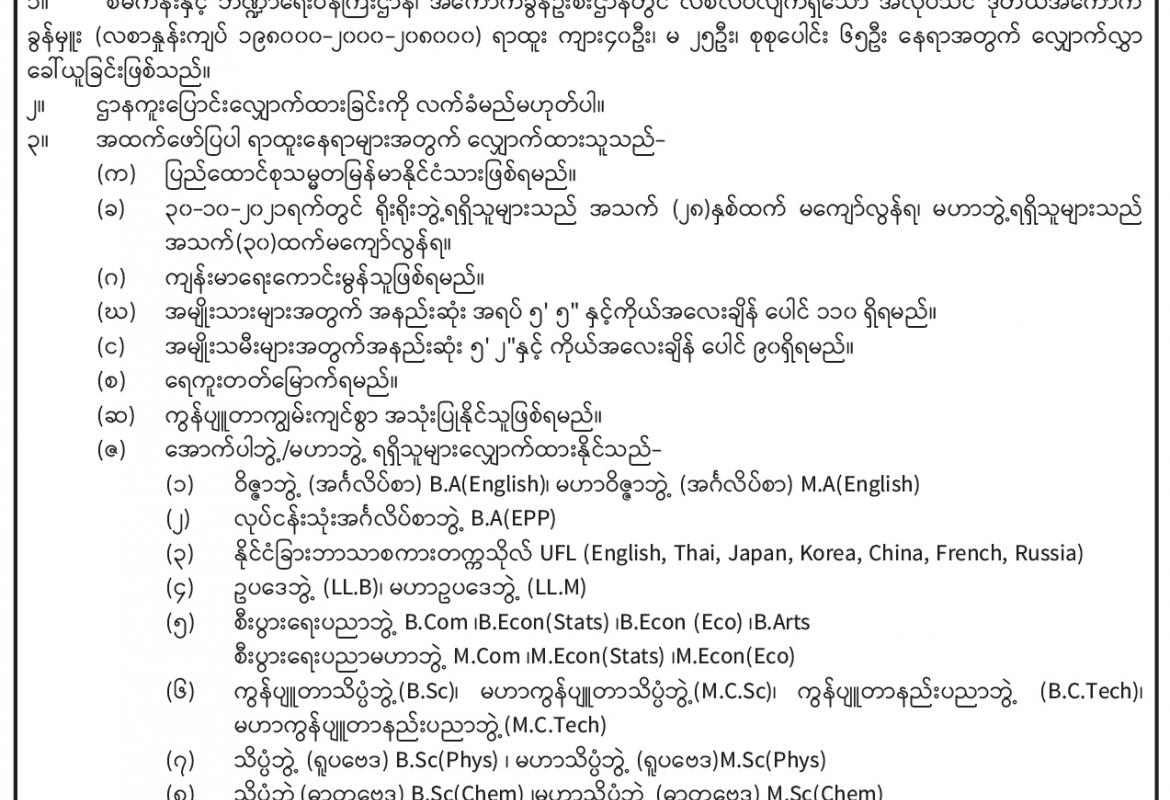 ရင်းနှီးမြှုပ်နှံမှုနှင့် နိုင်ငံခြားစီးပွားဆက်သွယ်ရေးဝန်ကြီးဌာန၊ နိုင်ငံခြားစီးပွားဆက်သွယ်ရေးဦးစီးဌာန ရုံးအမှတ် (၁) တွင် လစ်လပ်ရာထူးများအတွက် လျှောက်လွှာခေါ်ယူ