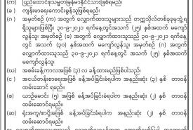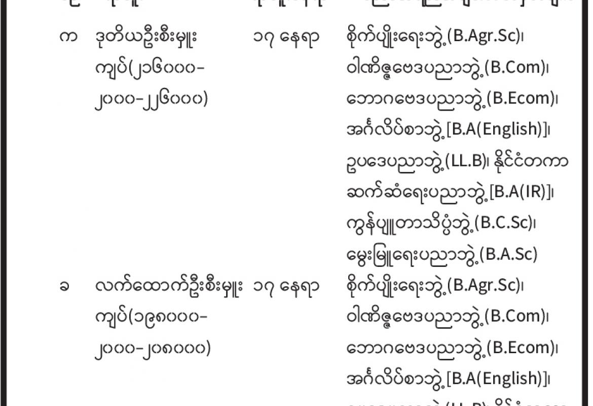 အလုပ်သမားဝန်ကြီးဌာနလက်အောက်ရှိ ဦးစီးဌာန၊ အဖွဲ့ရုံးများတွင် ခန့်ထားမည့် ဒုတိယဦးစီးမှူးနှင့် အငယ်တန်းစာရေး ရေးဖြေအောင်မြင်သူများ၏ အမည်စာရင်း ကြေညာခြင်းနှင့် လူတွေ့စစ်ဆေးခြင်း၊ ကွန်ပျူတာလက်တွေ့ဆန်းစစ်ခြင်းများ ပြုလုပ်မည့် အစီအစဉ်အသိပေးကြေညာ
