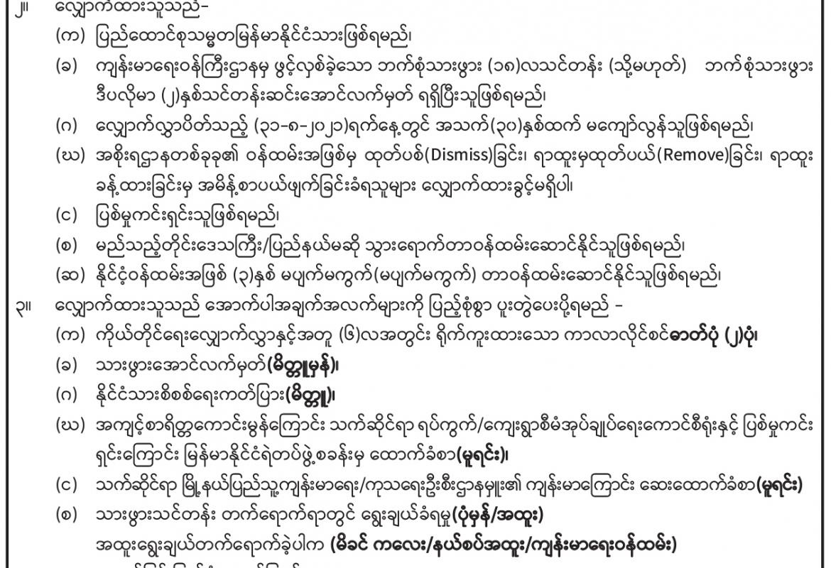 ဝန်ကြီးဌာနနှင့် အဖွဲ့အစည်း(၁၀)ခုတို့ရှိ ပြန်တမ်းဝင်အရာရှိအဆင့် စတင်ခန့် လစ်လပ်ရာထူး (၁၉၅)နေရာအတွက် ရေးဖြေစာမေးပွဲများ ကျင်းပမည်